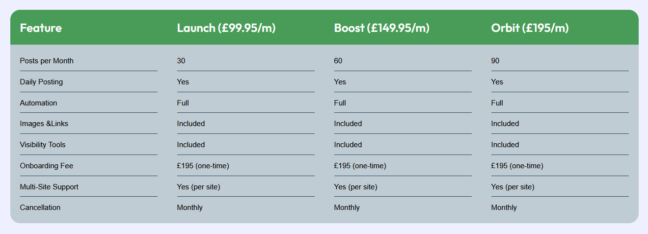 Launching starts at £99.95/month plus £195 onboarding. Two higher tiers offer more daily posts. See pricing for details. Automated SEO for UK SMEs makes premium content accessible, undercutting agencies by 50-70%. Invest in your growth without breaking the bank.